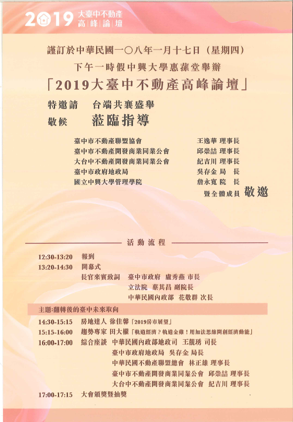臺中市不動產聯盟協會-訂於108年1月17日(星期四)下午1時假中興大學惠蓀堂(台中市南區興大路145號),舉辦「2019大臺中不動產高峰論壇」,相關活動內容請詳見附檔。