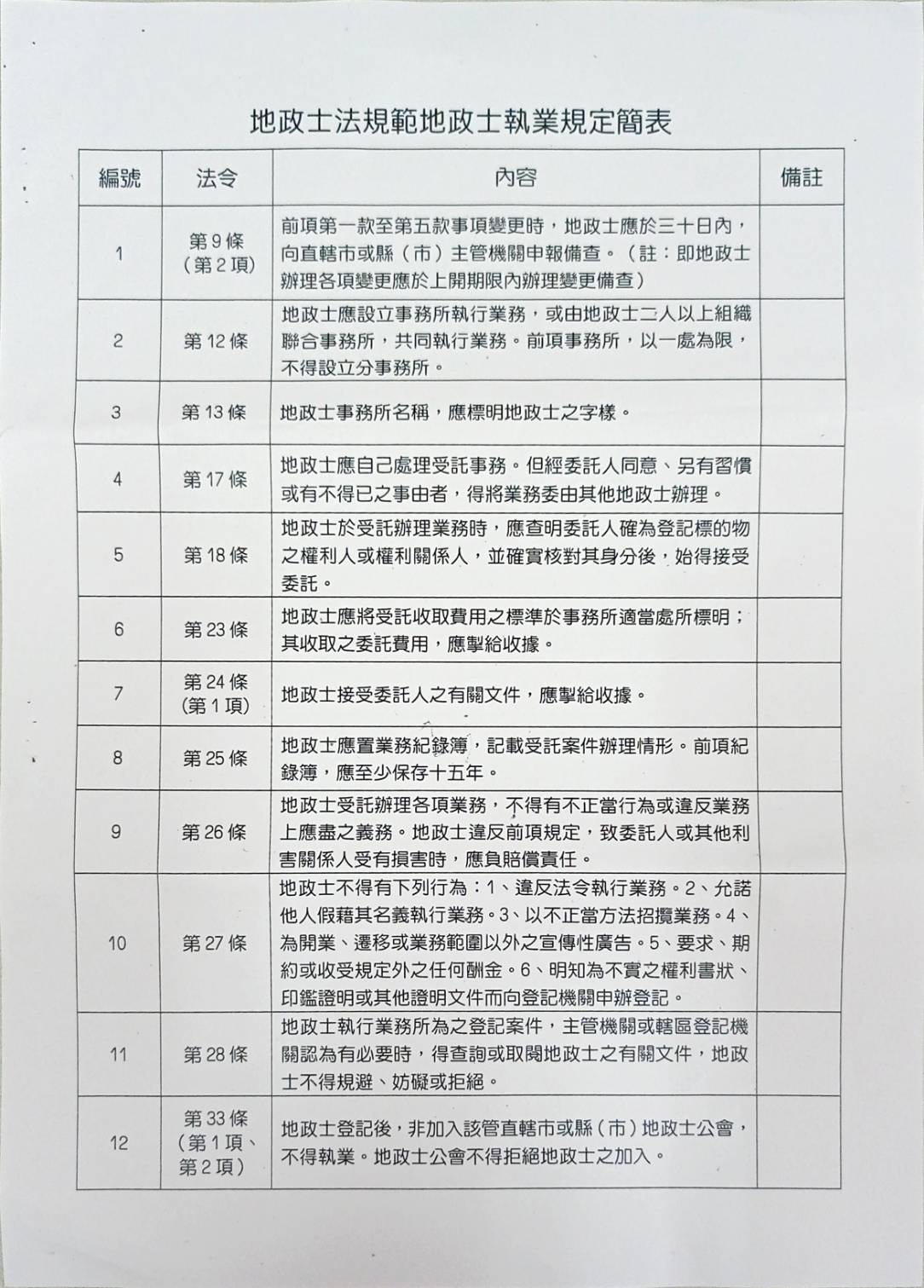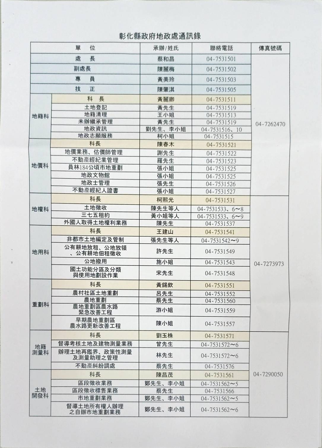 彰化縣政府地政處各業務承辦人通訊錄及地政士職業規定簡表