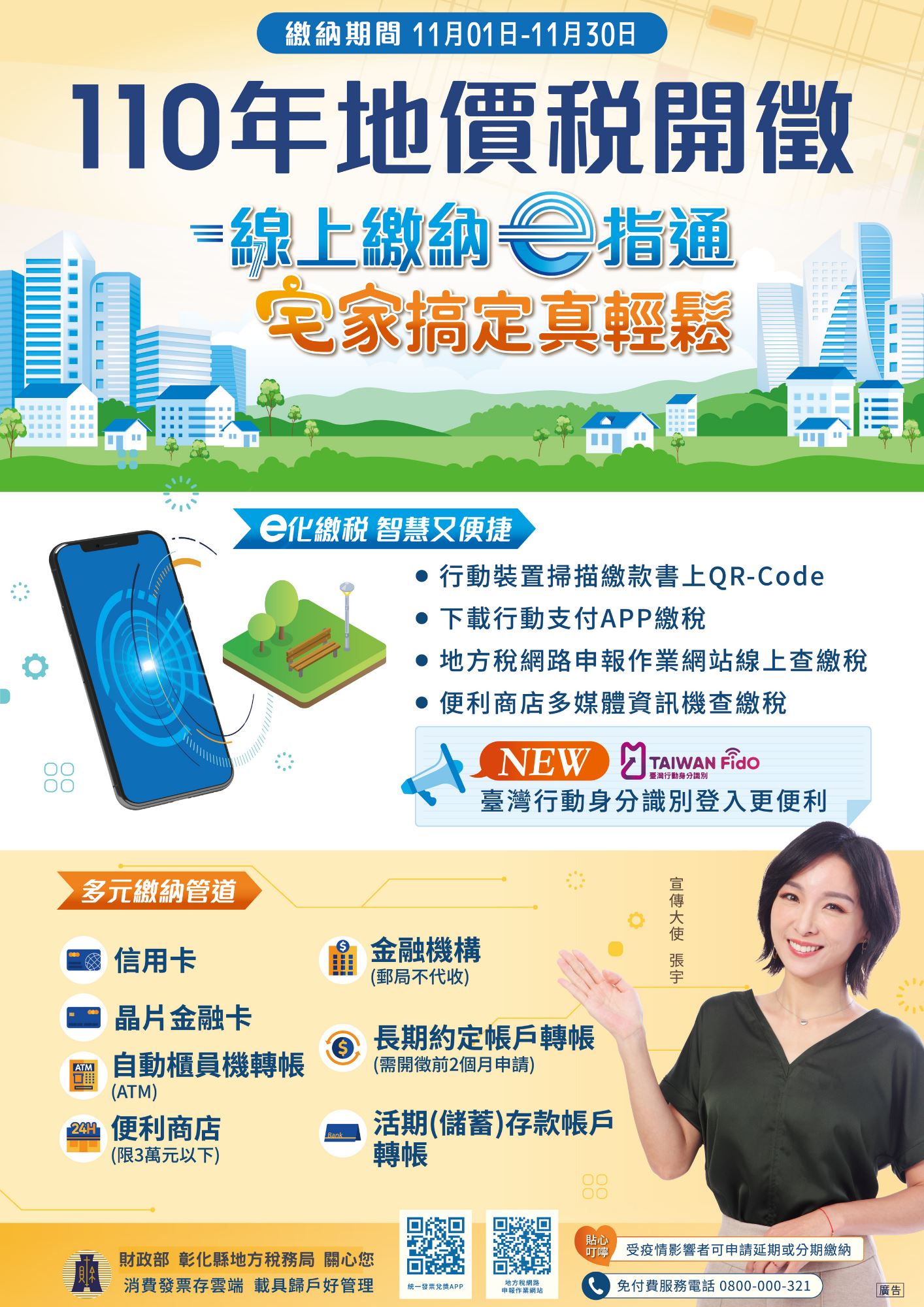 110年地價稅於11月開徵,繳納期限為110年11月1日至11月30日,敬請如期繳納。彰化縣地方稅務局免費服務電話0800-476969