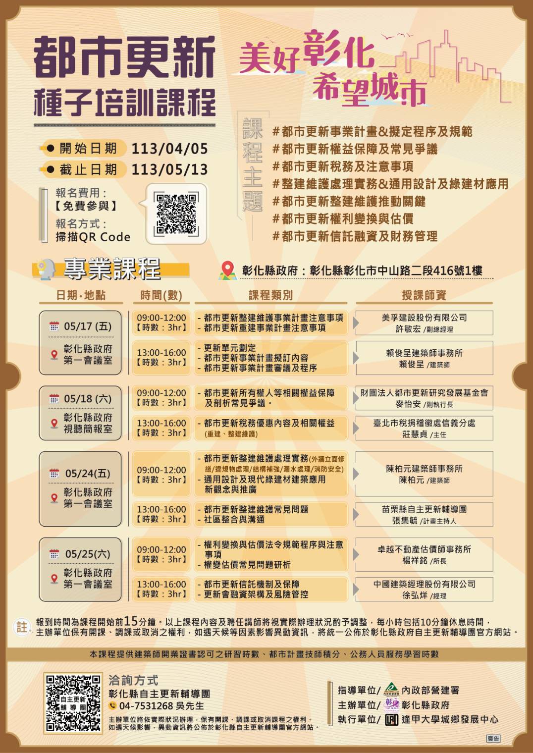 彰化縣政府辦理「彰化縣政府111-112年度中央都市更新基金補助委外成立自主更新輔導團」第2期自主更新人才培訓課程,請會員踴躍報名參加。(詳如附件)(2024/04/17)