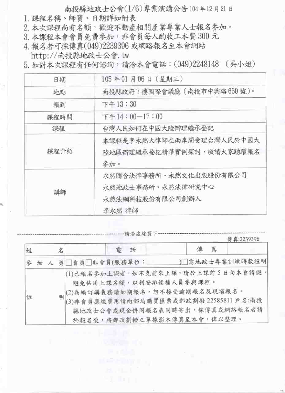 轉知南投縣地政士公會105/1/6舉辦地政士專業訓練課程(2015/12/28)轉知南投縣地政士公會擬訂於105/1/6(星期三),假南投縣政府7樓國際會議廳舉辦地政士專業訓練課程。