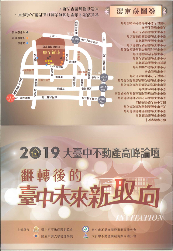臺中市不動產聯盟協會-訂於108年1月17日(星期四)下午1時假中興大學惠蓀堂(台中市南區興大路145號),舉辦「2019大臺中不動產高峰論壇」,相關活動內容請詳見附檔。