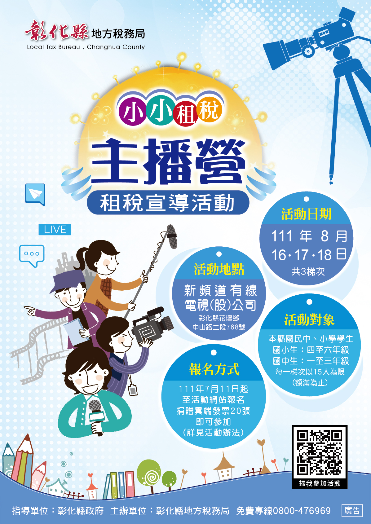 彰化縣地方稅務局函為落實租稅教育,舉辦「小小租稅科學家」及「小小租稅主播營」夏令營活動(詳如附件)。(2022/07/07)彰化縣地方稅務局為落實租稅教育,舉辦「小小租稅科學家」及「小小租稅主播營」夏令營活動。