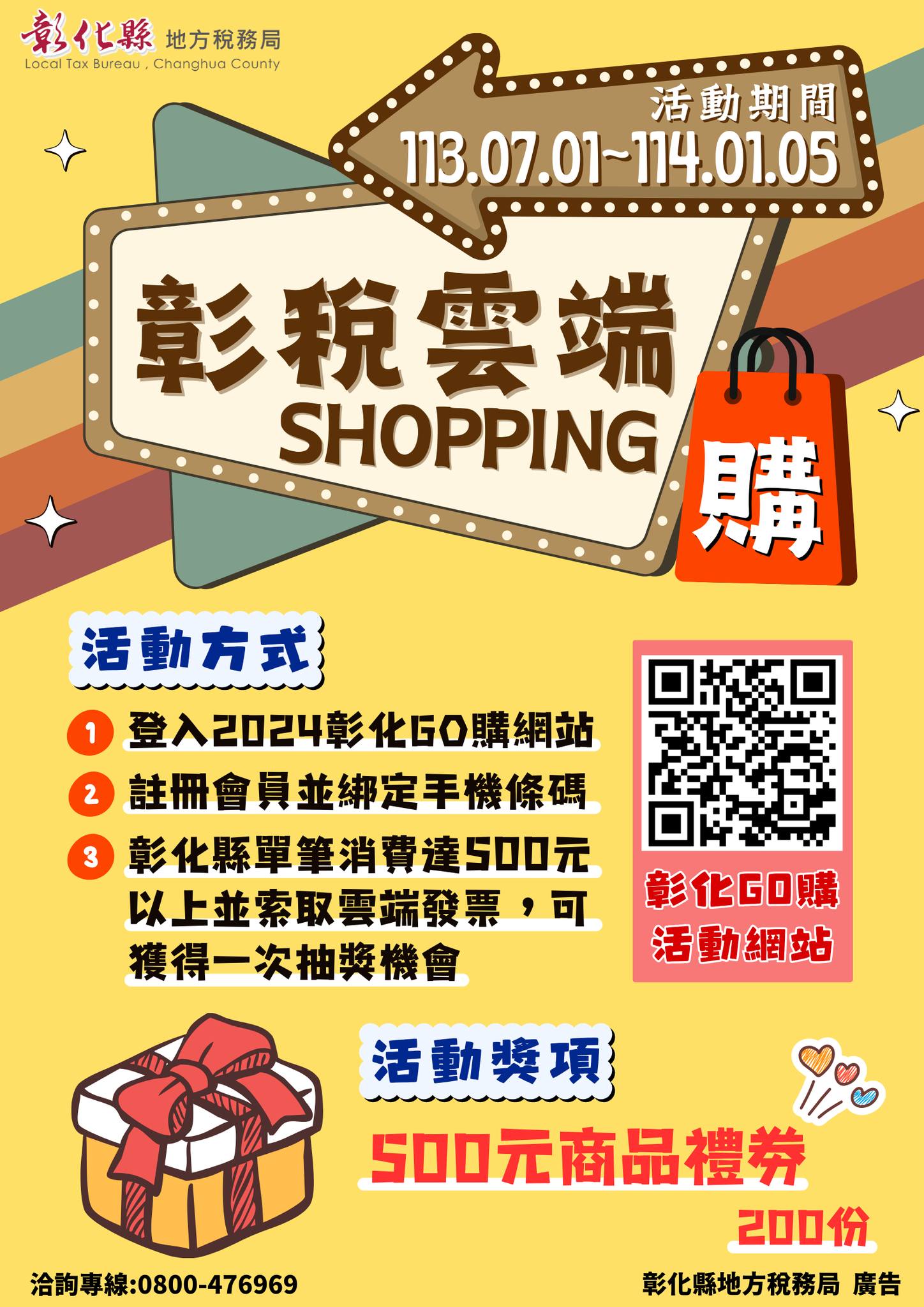 彰化縣地方稅務局舉辦113年「彰稅雲端Shopping購」活動,請會員踴躍參加(詳如附件)(2024/08/01)彰化縣政府為鼓勵消費刺激市場經濟 舉辦「2024彰化Go購-消費抽獎活動」