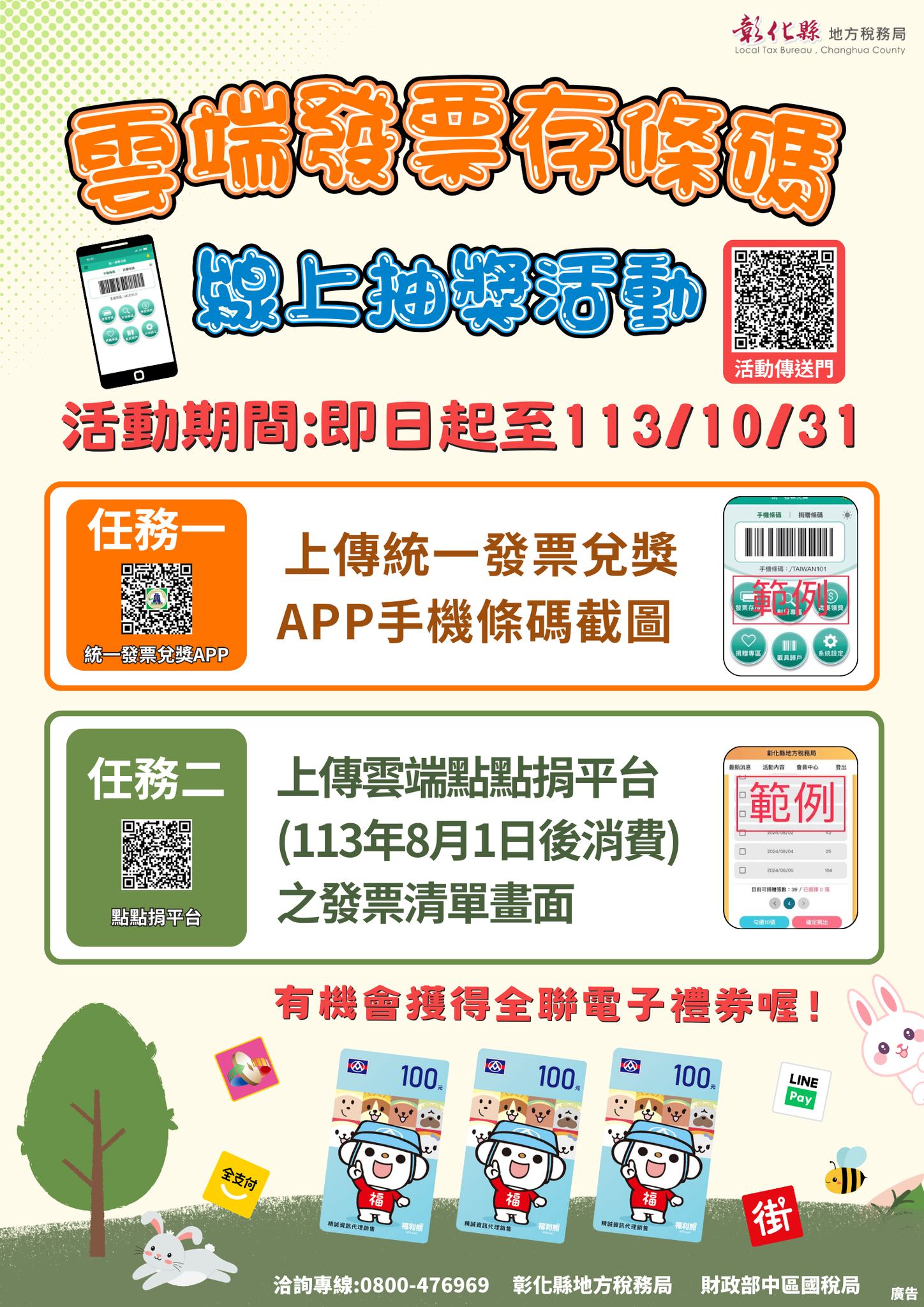 彰化縣地方稅務局舉辦113年「雲端發票存條碼線上抽獎活動」,請會員踴躍參加(詳如附件)(2024/08/26)「雲端發票存條碼」線上抽獎活動開跑囉!