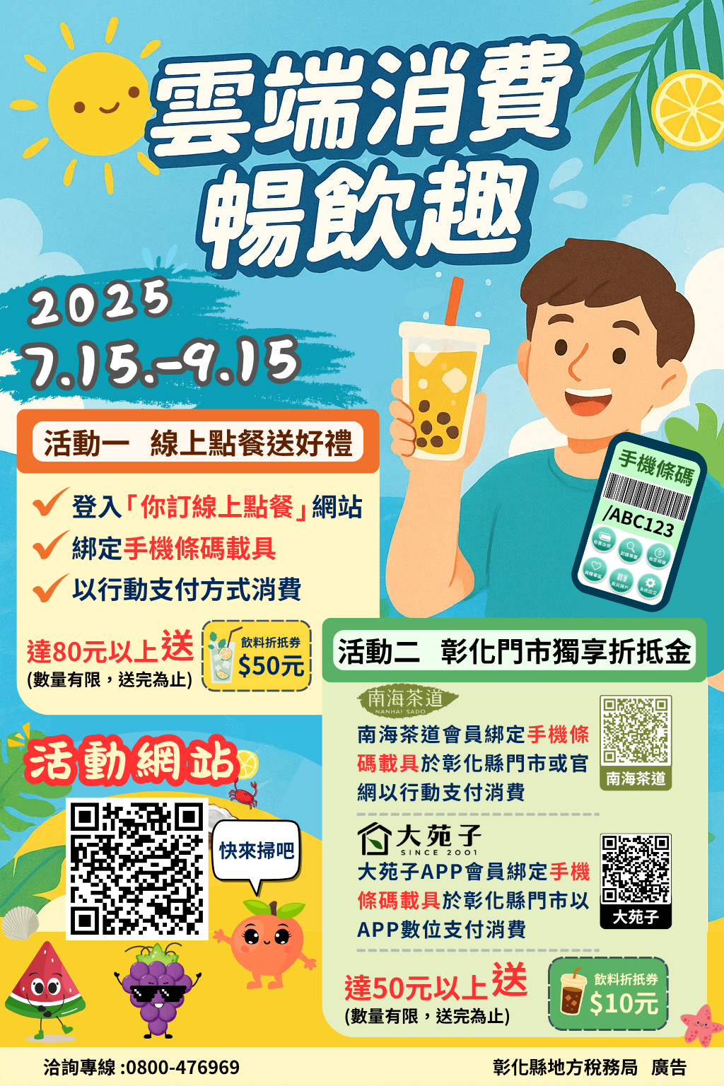 轉知彰化縣地方稅務局租稅宣導(2025/07/09)「雲端消費暢飲趣」飲料折抵金 讓你沁涼一夏!