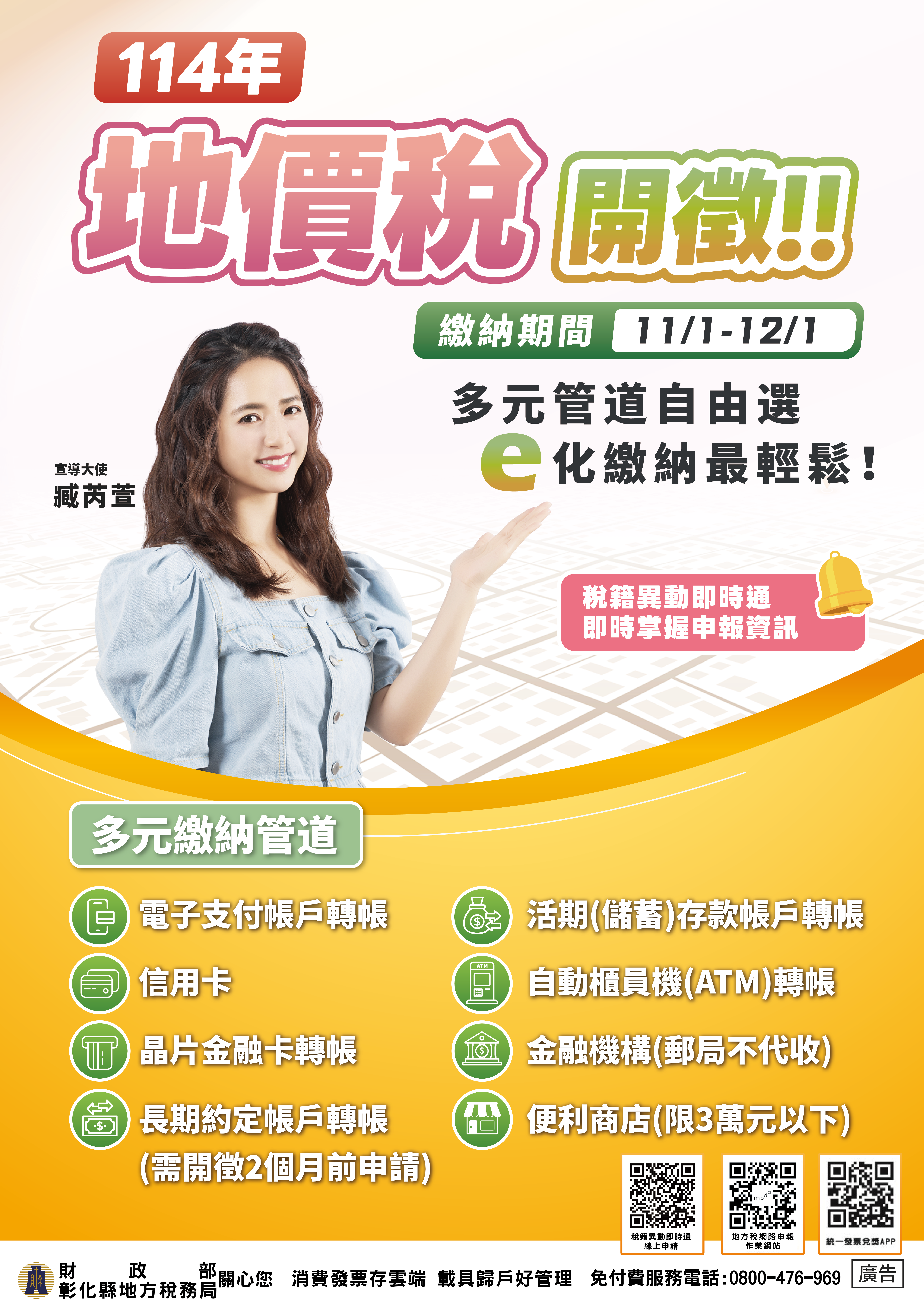 轉知彰化縣地方稅務局租稅宣導(2025/10/30)114年地價稅於11月1日開徵 請如期繳納以免受罰